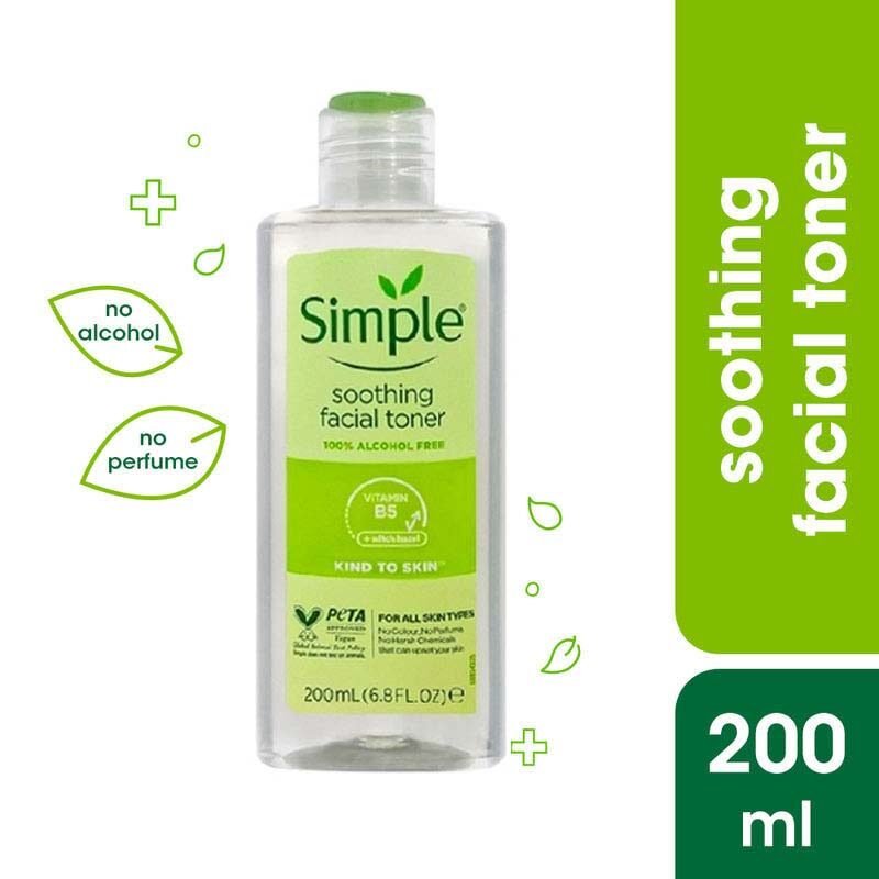 Simple Soothing Facial Toner 200ml is an alcohol-free, gentle toner suitable for all skin types, especially sensitive skin, designed to hydrate, refresh, and restore the skin’s natural pH balance